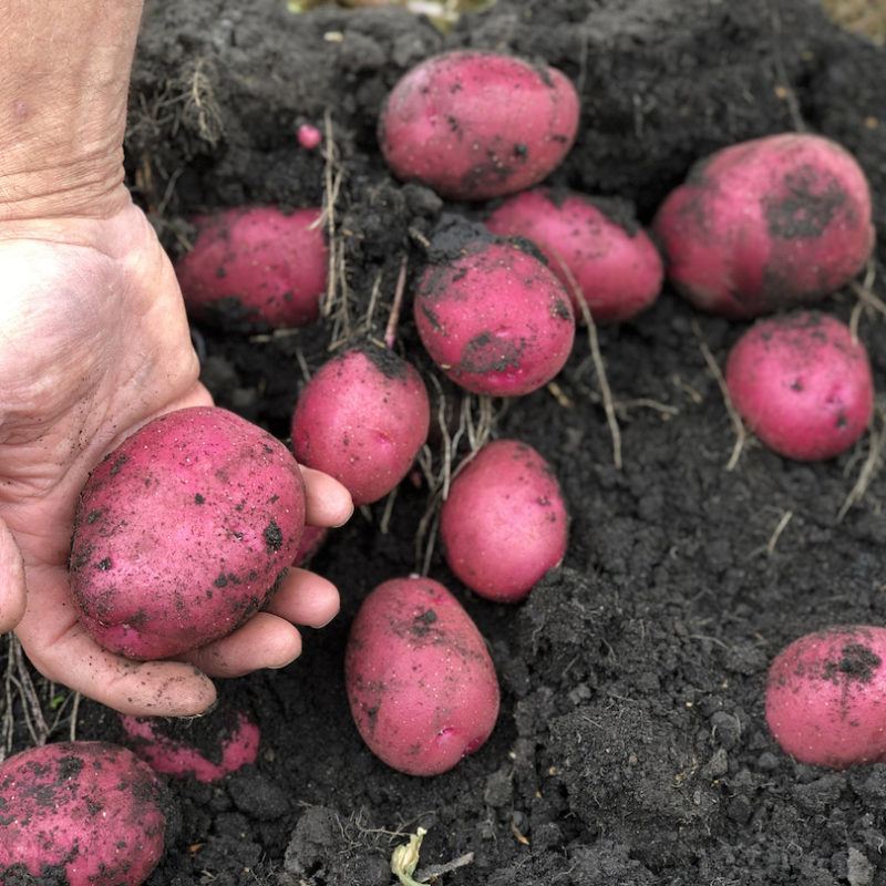 Space whole seed potatoes approximately 25-30 cm (10″-12″) apart. This variety matures relatively early and is ready in about 75-85 days. It is an excellent garden variety especially when grown in areas where scab can be a problem. Give adequate nutrients at planting time.