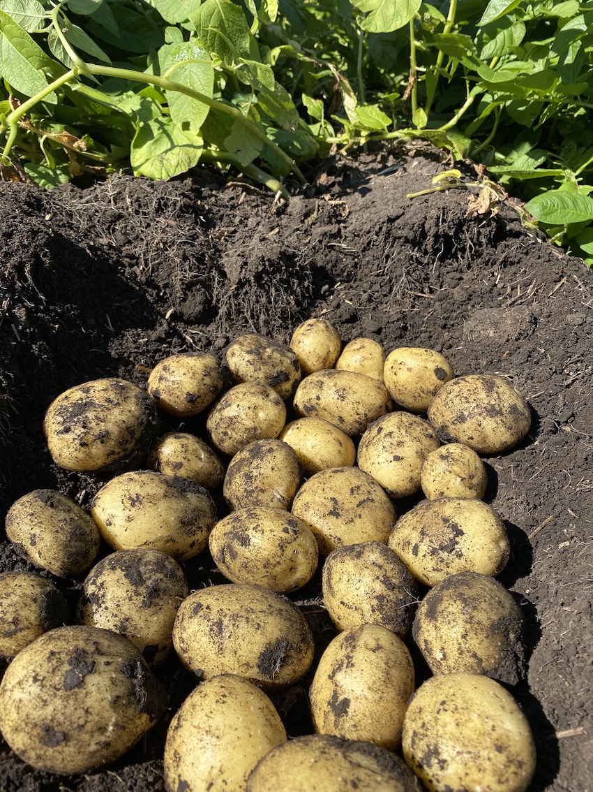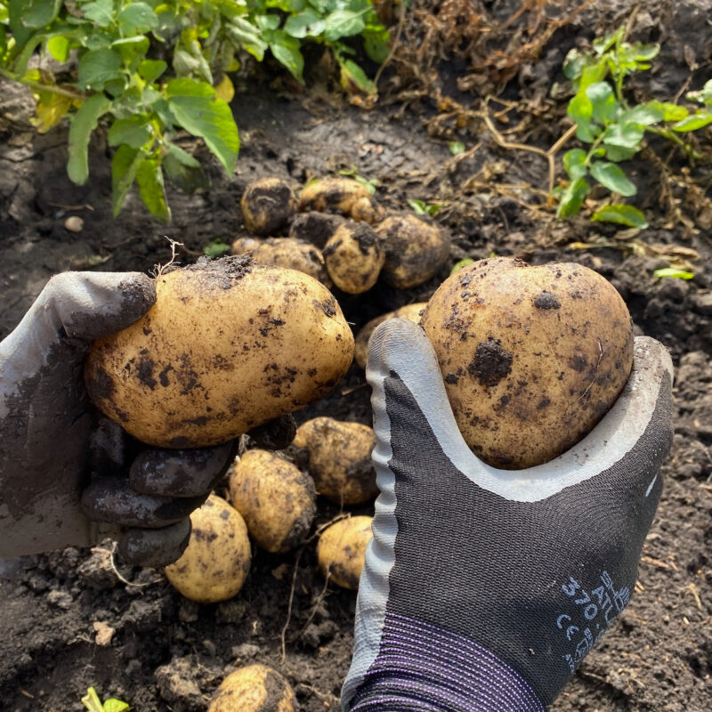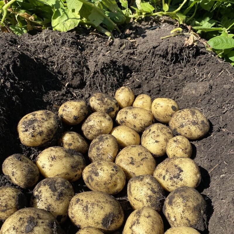 Space whole seed potatoes approximately 25-30 cm (10″-12″) apart. This variety matures late-season and is ready in about 100-110 days. It is an excellent garden and container variety that shows very good resistance to common scab, and is also heat and drought tolerant. Give adequate nutrients at planting time.